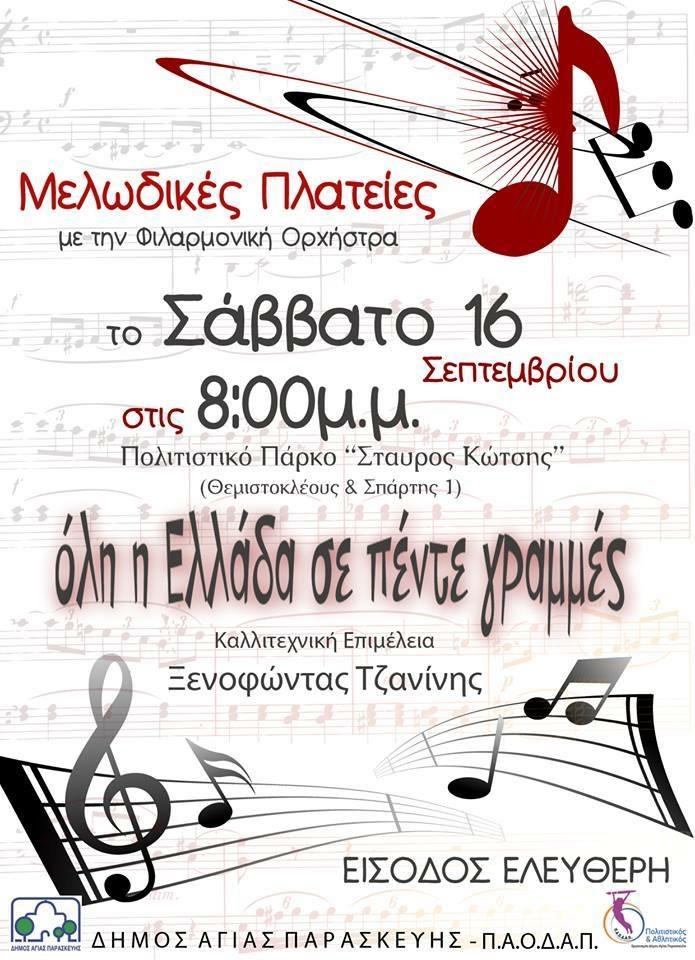 Η πρώτη σειράς Συναυλιών της Φιλαρμονικής Ορχήστρας του Δήμου Αγίας Παρασκευής με τίτλο «Μελωδικές Πλατείες» και υπότιτλο «Όλη η Ελλάδα σε πέντε γραμμές» θα λάβει χώρα το Σάββατο 16/9, στις 8:00μμ, στο Ανοικτό Θέατρο του Δήμου Αγίας Παρασκευής, στο Πάρκο «Σταύρος Κώτσης» πρ. Στρατόπεδο «Σπυρούδη» (Σπάρτης 1-Αγ. Παρασκευή).
