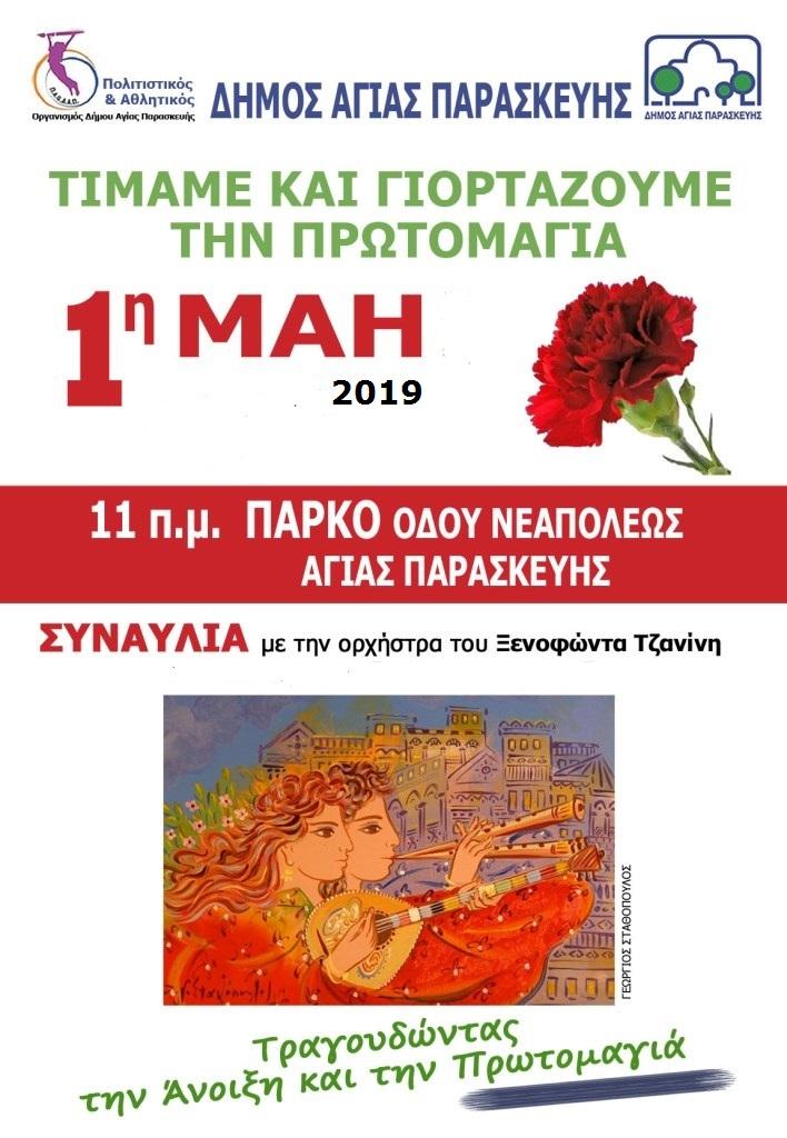 Ο Δήμος Αγίας Παρασκευής και ο Πολιτιστικός και Αθλητικός Οργανισμός του Δήμου-ΠΑΟΔΑΠ, διοργανώνουν εκδήλωση για να τιμήσουμε και να γιορτάσουμε την Πρωτομαγιά την Τετάρτη 1/5 στις 11:00πμ, στο Πάρκο της οδού Νεαπόλεως.