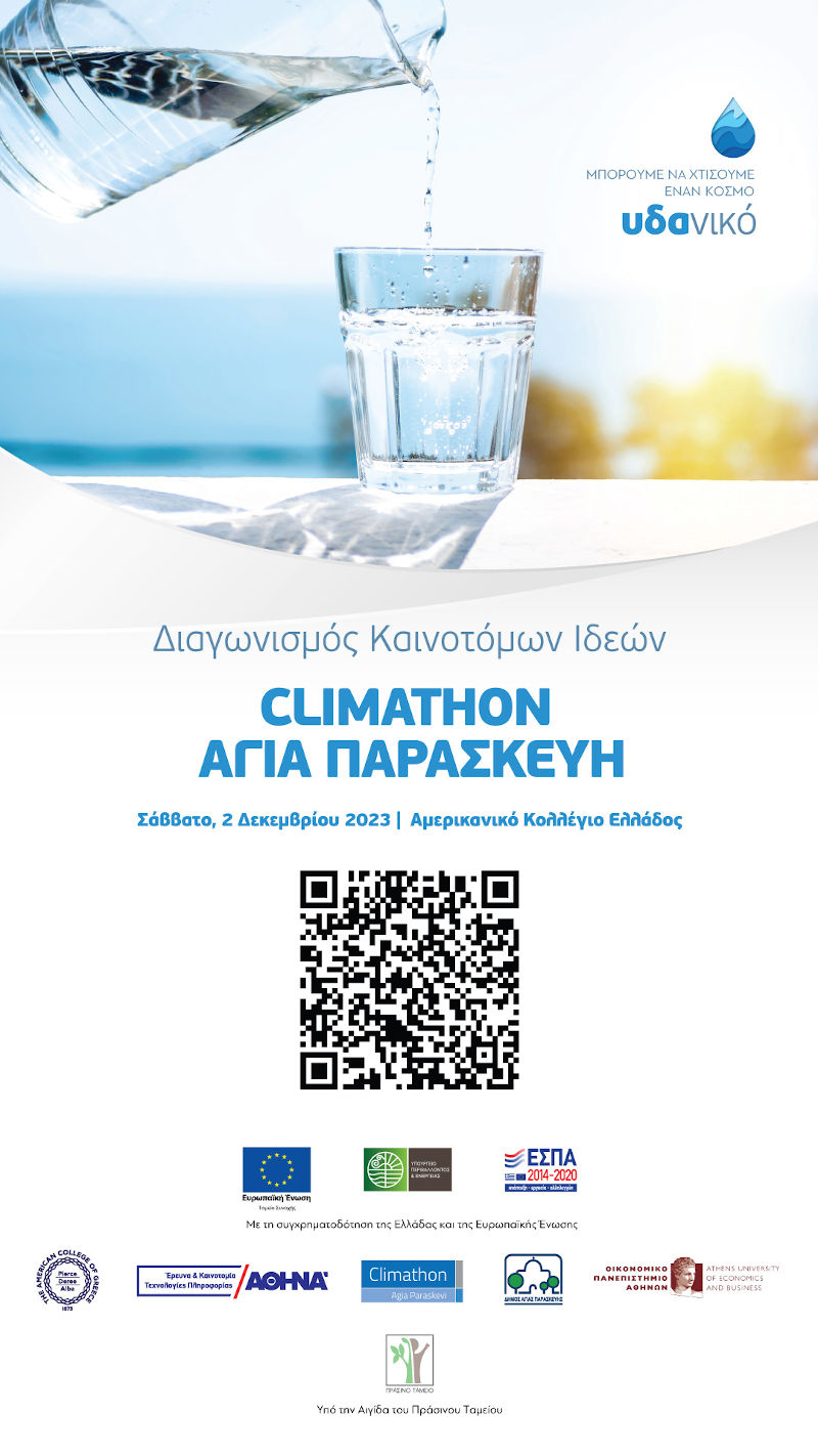 Η Γενική Γραμματεία Φυσικού Περιβάλλοντος και Υδάτων σε συνεργασία με το Αμερικάνικο Κολλέγιο Ελλάδος, τη Μονάδα Αειφόρου Ανάπτυξης – ΕΚ ΑΘΗΝΑ, του Δήμου Αγίας Παρασκευής και με την υποστήριξη και του Οικονομικού Πανεπιστημίου Αθηνών διοργανώνουν το Climathon - Αγία Παρασκευή το Σάββατο, 2 Δεκεμβρίου 2023 στο Αμερικανικό Κολλέγιο Ελλάδος (Event Hall, 09:00-22:00) με τίτλο " CLIMATHON με θέμα πρόκλησης ‘Νερό, Φύση και Άνθρωπος’, καθώς και την Ημερίδα με τίτλο "Καλές πρακτικές στην διαχείριση των υδάτων", που θα πραγματοποιηθεί την Πέμπτη 30 Νοεμβρίου 2023 και ώρα 18:00-21:00 στο Event Hall του Αμερικανικού Κολλεγίου.