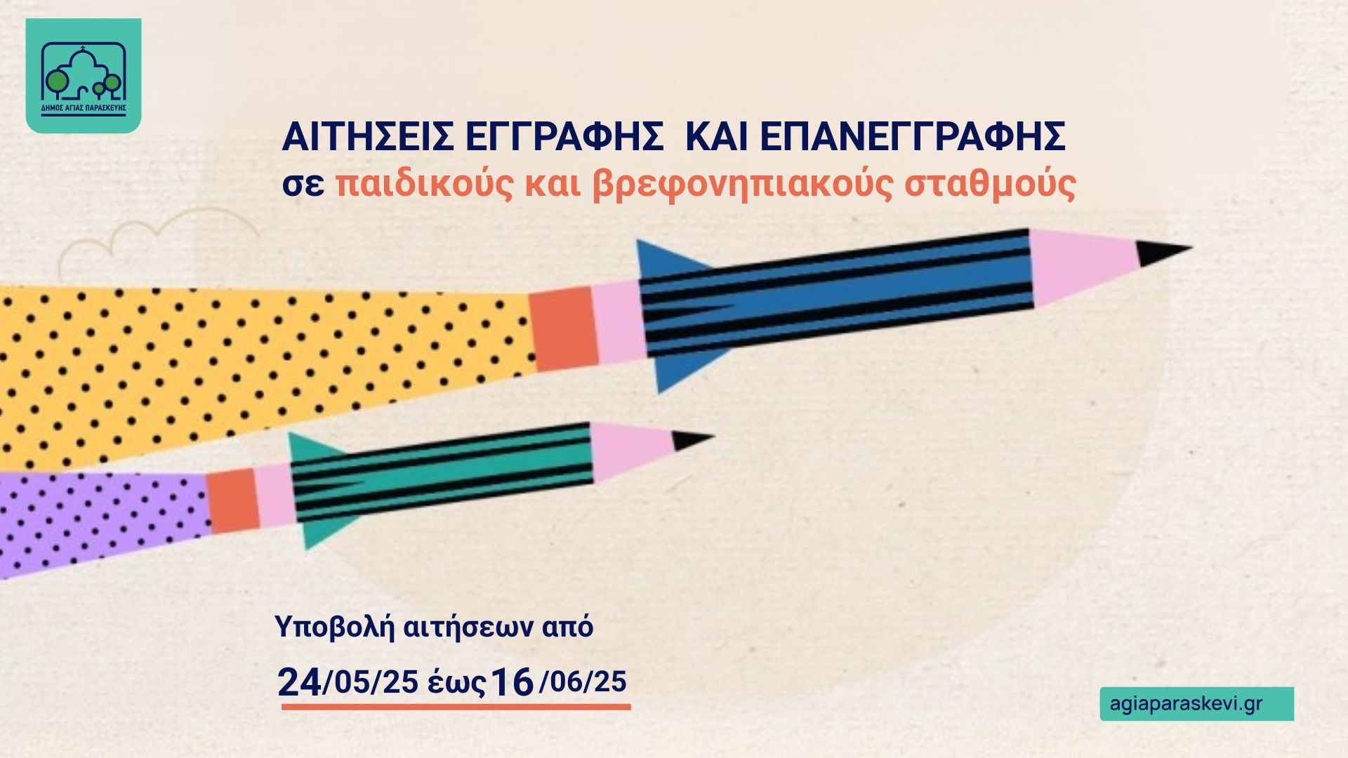 Ο Δήμος Αγίας Παρασκευής ενημερώνει πως η υποβολή αιτήσεων για τις εγγραφές βρεφών και νηπίων στους βρεφονηπιακούς και παιδικούς σταθμούς του Δήμου (ΠΑΙΣΔΑΠ), για τη σχολική περίοδο 2025-2026, θα ξεκινήσει να πραγματοποιείται ηλεκτρονικά από αύριο Σάββατο 24 Μαΐου 2025 και θα ολοκληρωθεί την Δευτέρα 16 Ιουνίου 2025 και ώρα 23.59.59.