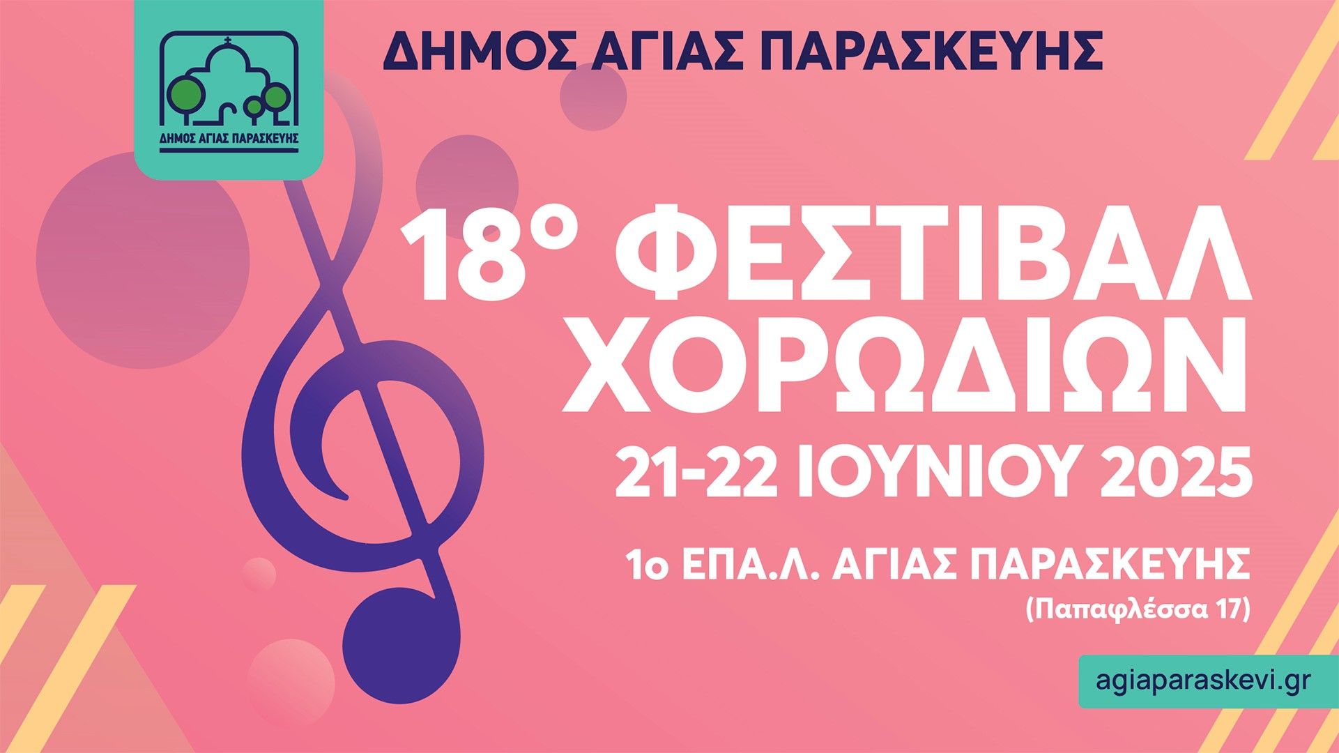 ε αφορμή την Παγκόσμια Ημέρα Μουσικής, ο Δήμος Αγίας Παρασκευής διοργανώνει το 18ο Φεστιβάλ Χορωδιών και υποδέχεται χορωδιακά σχήματα από όλη την Ελλάδα για δύο αξέχαστες βραδιές γεμάτες μελωδίες και αρμονία.