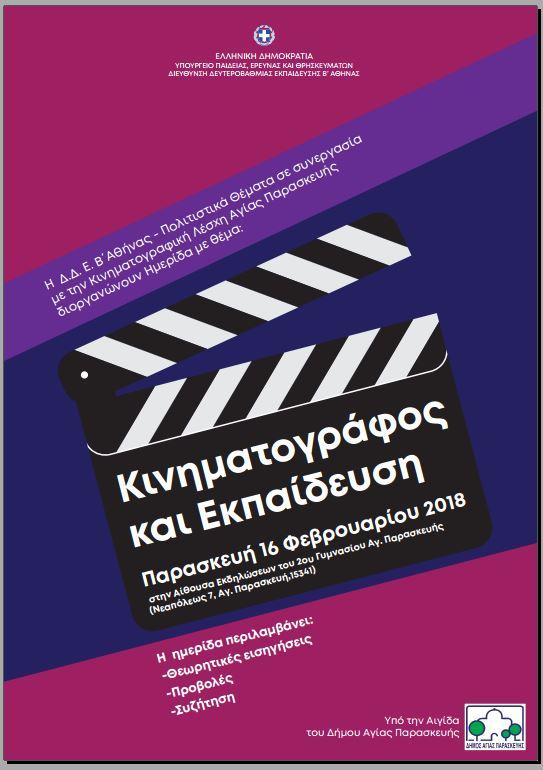 Η Κινηματογραφική Λέσχη Αγ.Παρασκευής και η Διεύθυνση Δευτεροβάθμιας Εκπαίδευσης Β΄Αθήνας του Υπουργείου Παιδείας διοργανώνουν ημερίδα για τους εκπαιδευτικούς της περιφέρειας Αττικής με θέμα «Κινηματογράφος και Εκπαίδευση»